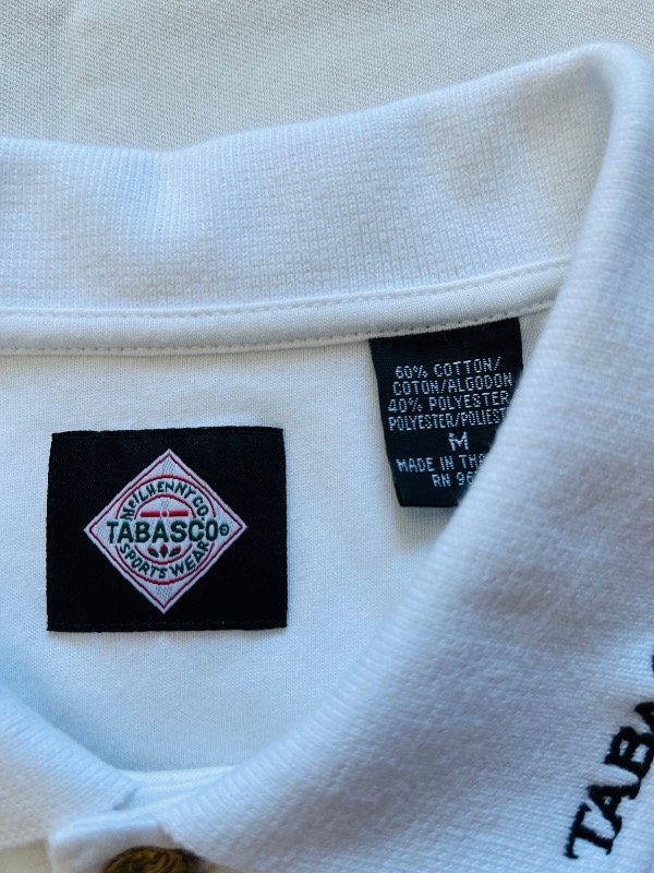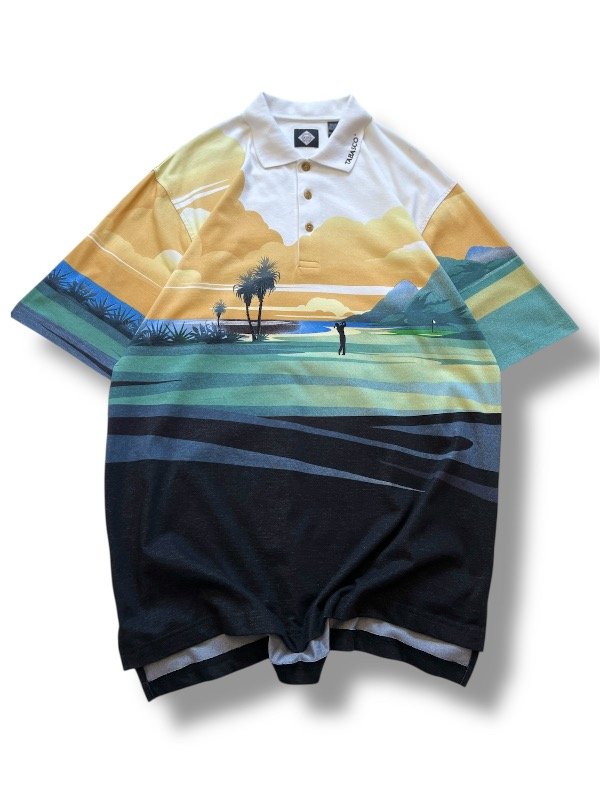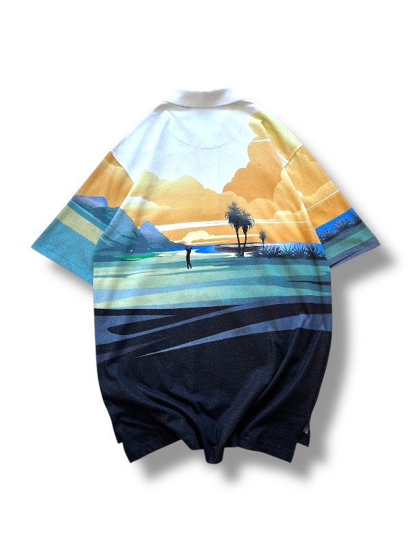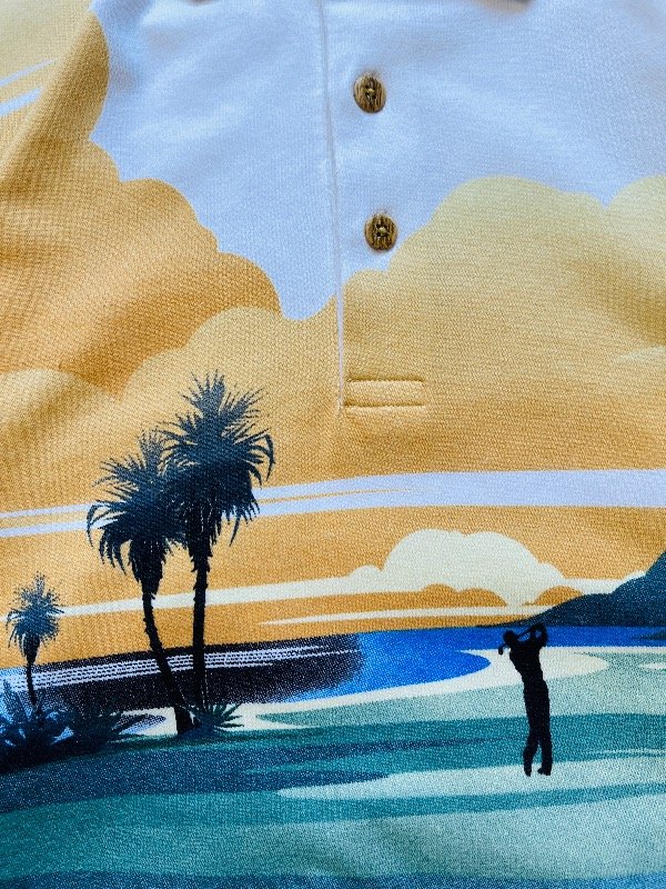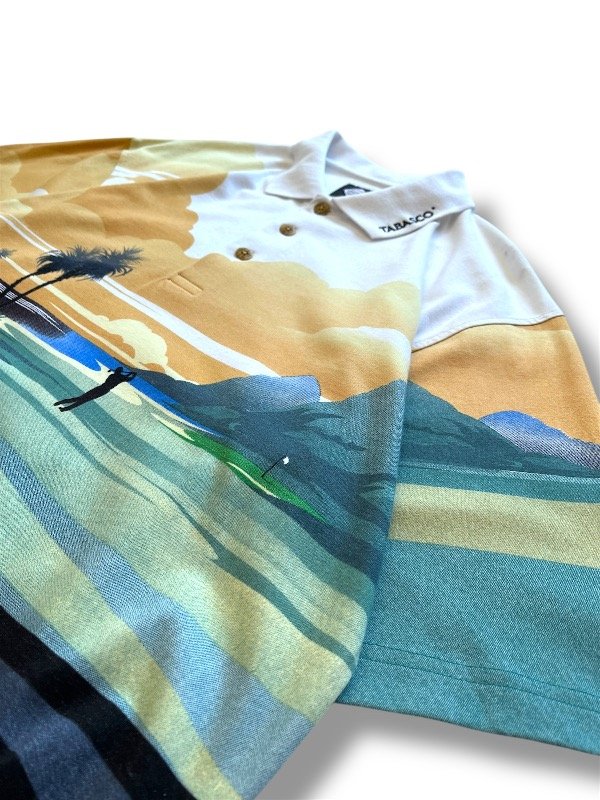 • CHOMBA TABASCO - mangas cortas, blanca con estampado de cancha de golf al atardecer, en frente y espalda, talle M