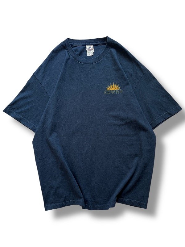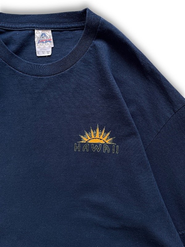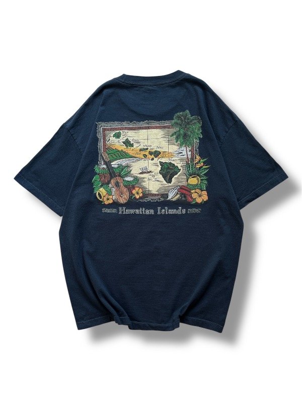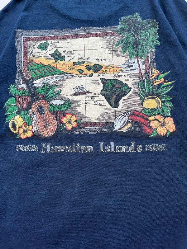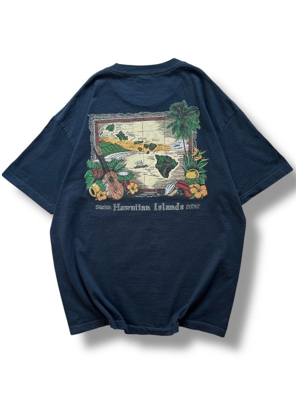 • REMERA ALSTYLE - mangas cortas, azul, big estampa en la espalda (de mapa "HAWAIIAN ISLANDS") y chiquita en el pecho ("HAWAII"), talle XL